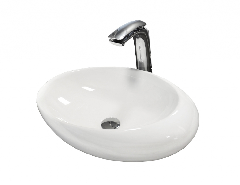 Śnieżnobiała umywalka ceramiczna blatowa, o oryginalnym i niepowtarzalnym wyglądzie. Niespotykany, owalny kształt.